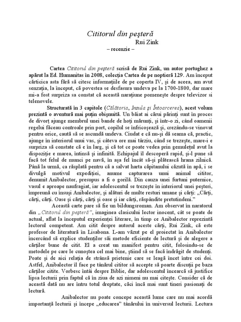 Cititorul din peşteră este o poveste. Până la acest moment, „cititorul din peșteră rămâne a fi una din cele mai valoroase, mai didactice și mai accesibile cărți, care deschide lumii nu o perspectivă de cunoaștere, ci mai degrabă un tablou al actualității, fiind un depozit intertextual de mare importanță. O anibaleitor traducerea din limba portugheză de: Povestea, spusă cu umor şi fără ostentaţie moralizatoare, este a unui copil debusolat care descoperă lumea şi.